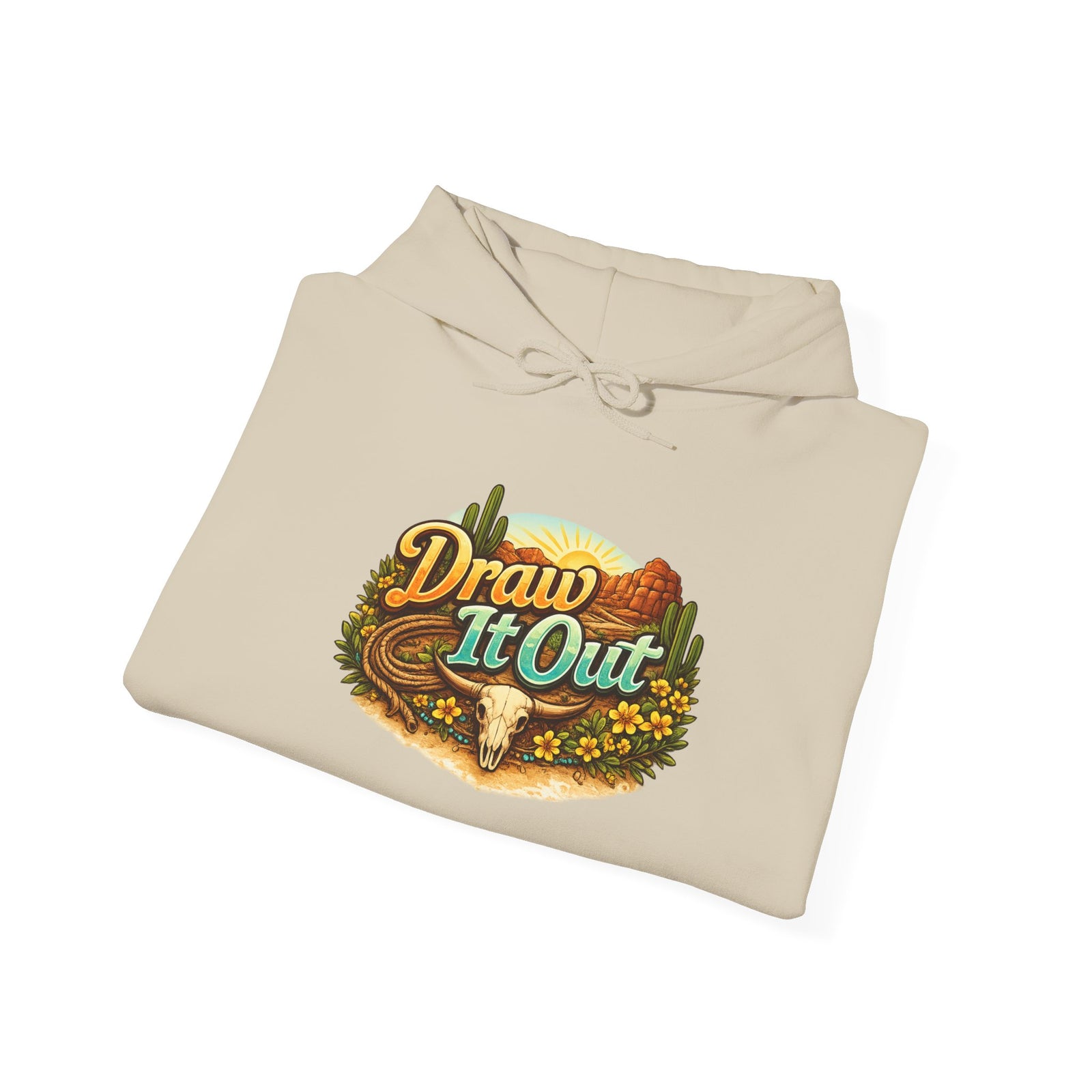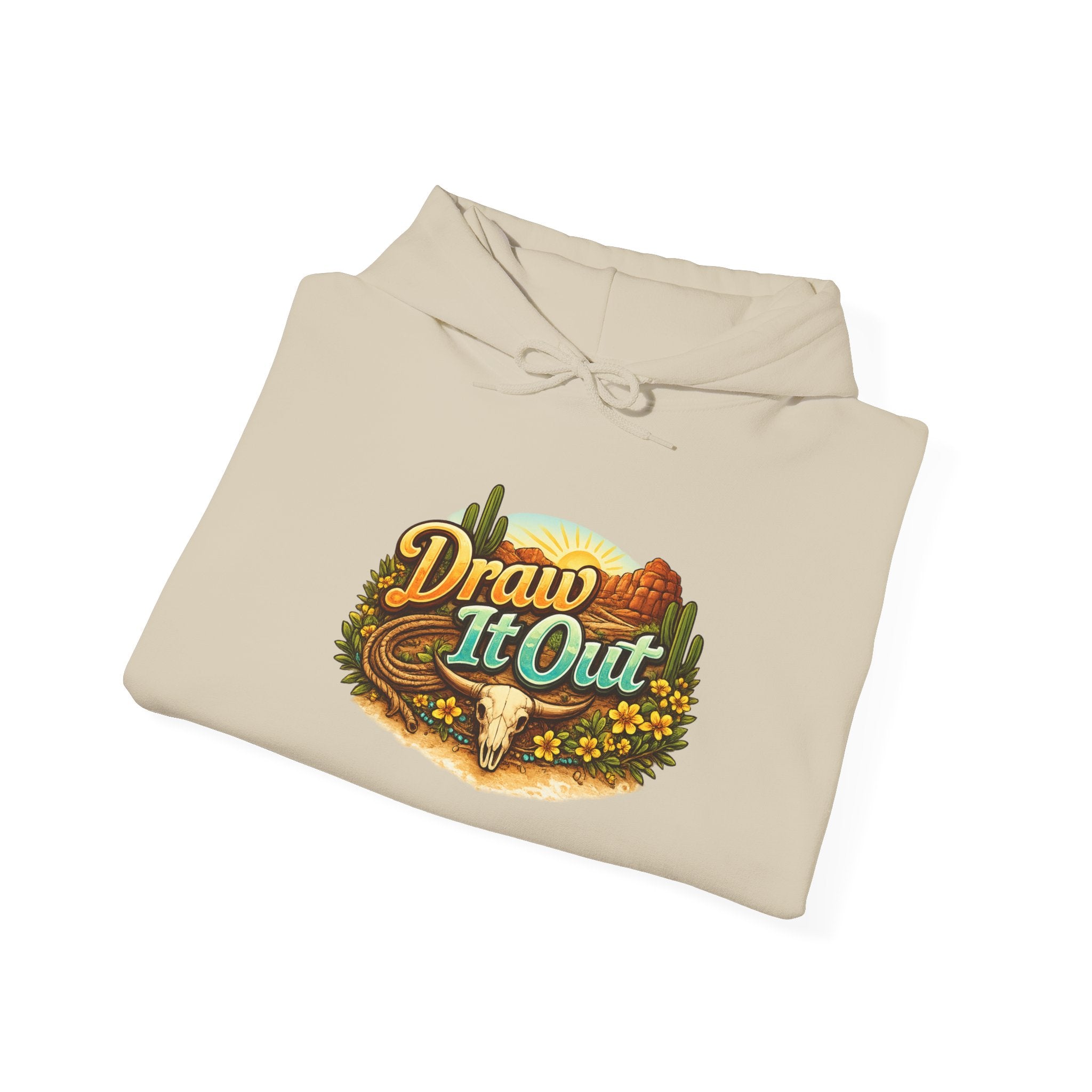 The Draw It Out® Desert Sunset Graphic Hoodie is the layer you grab when comfort matters but style still counts. A vintage-inspired, nature-forward chest graphic sets the tone with sunset hues, pine silhouettes, and a worn-in texture that feels collected rather than loud. Subtle lettering across the back adds interest without pulling focus.
